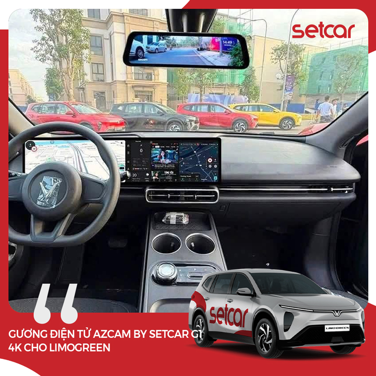 Nếu bạn cần một nâng cấp vừa tăng tầm nhìn, vừa ghi hình hành trình chất lượng cao, lại tối ưu tính tiện dụng cho LimoGreen, thì gương điện tử Azcam by Setcar G1 4K đáp ứng đầy đủ: màn hình 9,7 inch cảm ứng, chống chói AI, IP67, khởi động 5 giây, ghi hình 4K trước + 1080 sau với tự cân bằng sáng ban đêm, hỗ trợ microSD 128GB, hiển thị trước/sau góc rộng, có GPS và kết nối app Android/iOS tải video qua Wi-Fi, cùng tích hợp cam lùi. Sản phẩm lắp Plug & Play giữ điện zin và đi kèm bảo hành điện tử 2 năm theo tiêu chuẩn Setcar.