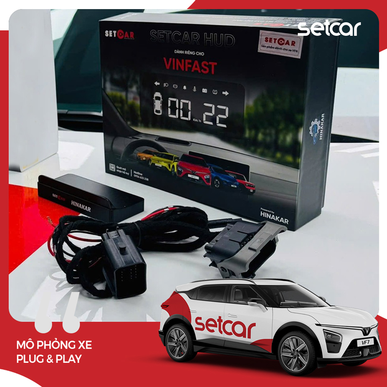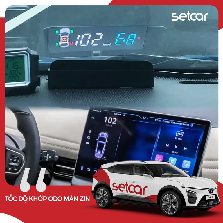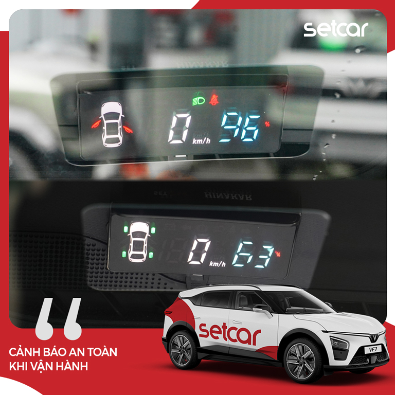 HUD SetCar dành cho VinFast VF7 được thiết kế để đưa những thông tin cần thiết lên vùng quan sát thuận tiện, giúp người lái nắm nhanh trạng thái xe và chủ động hơn khi di chuyển. Điểm nhấn quan trọng của HUD VF7 SetCar là khả năng hiển thị tốc độ thường trực với độ chính xác 100% so với ODO trên màn hình zin, đồng thời bổ sung các cảnh báo vận hành quan trọng theo cách hiển thị gọn và trực quan, phù hợp thói quen sử dụng thực tế.