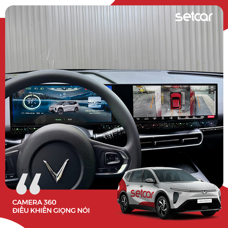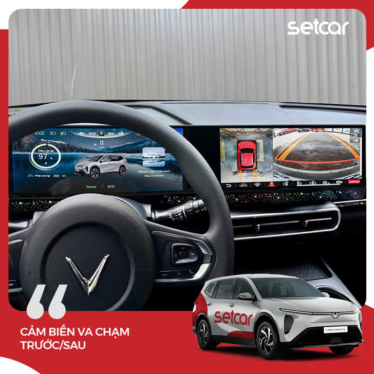 Màn hình dài SetCar Vision cho LimoGreen là lựa chọn phù hợp cho người dùng muốn nâng cấp toàn diện trên một hệ thống: 2 màn 12.3 inch sắc nét (1900×720), cấu hình mạnh với Unisoc T7870 và Android 13, âm thanh nâng cấp nhờ DSP AKM + ampli, phần mềm tối ưu riêng cho LimoGreen hỗ trợ 2 màn độc lập, chia 3 ứng dụng, hiển thị thông số xe và quản lý sạc ngay trên Android. Về an toàn, hệ thống tích hợp camera 360 và trợ lý ảo giọng nói. Ngoài ra, người dùng có thể mở rộng theo nhu cầu với TPMS hiển thị trên Vision UI và cảm biến va chạm trước/sau (đều là option mua thêm). Đi kèm là cam kết lắp đặt thẩm mỹ, giữ tính năng zin, cập nhật online và bảo hành điện tử 2 năm.