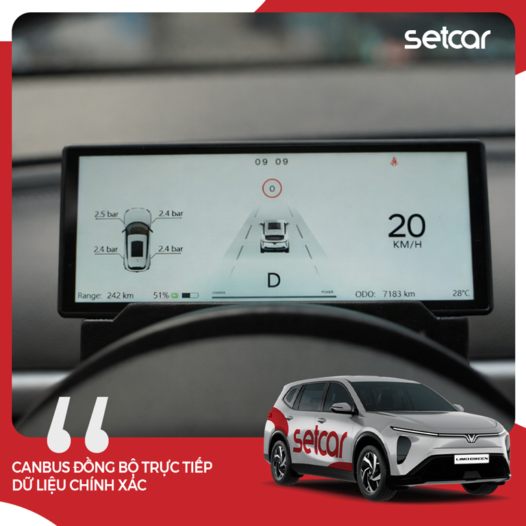 Một yếu tố cốt lõi khác là dữ liệu đồng bộ trực tiếp từ CANBUS, giúp thông tin hiển thị có độ chính xác đáng tin cậy. Về hoàn thiện, sản phẩm đi kèm ốp nhựa cổ vô lăng nhằm giữ thiết kế sang trọng, đồng bộ với nội thất của xe. Cuối cùng, Setcar đưa ra cam kết bảo hành rõ ràng với bảo hành điện tử 2 năm theo tiêu chuẩn của hãng.
