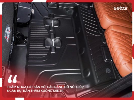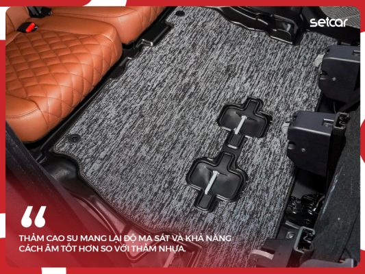Các chuyên gia tại Setcar khuyên rằng nếu bạn có điều kiện kinh tế dư dả hơn, hãy ưu tiên sử dụng thảm lót sàn bằng cao su thay vì thảm nhựa lót sàn xe ô tô. Thảm cao su mang lại độ ma sát cao, khả năng chống trượt vượt trội và tuổi thọ có thể lên tới hơn 5 năm sử dụng liên tục.