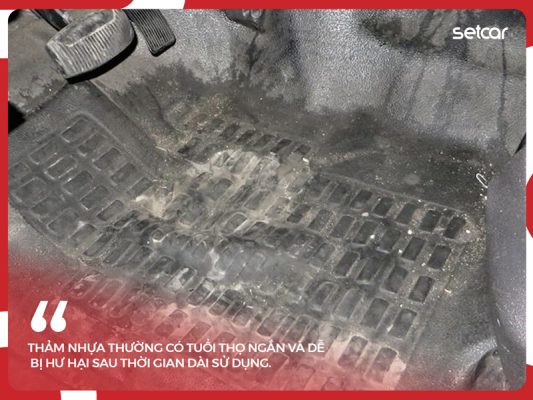 - Tuổi thọ sử dụng ngắn: Một trong những nhược điểm lớn nhất của thảm nhựa lót sàn xe ô tô chính là độ bền không cao bằng các dòng thảm làm từ cao su tự nhiên hay nhựa đúc cao cấp. Thông thường, loại thảm này chỉ có tuổi thọ trung bình từ 1 đến 2 năm trước khi xuất hiện các dấu hiệu hư hại.